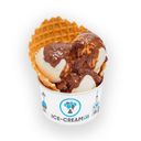 Freshly prepared chocolate flavored ice cream served with chocolate chips on top