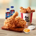 Enjoy 6 pcs hot & crispy bucket, 6 pcs hot wings, 1 spicy mayo, 1 sweet mayo & 4 pepsi go pack