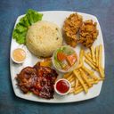 1:1 - Consists of fried rice, chicken steak, 2 pcs crispy chicken, chinese vegetable & french fries