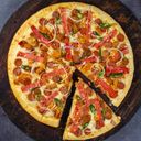 Topped with beef & chicken both with freshly cut vegetables, cheese & in a soft pizza dough