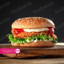 1:1 - A delightful burger prepared with a crispy patty, a slice of melted cheese & fresh topping