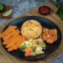 1:1 - Consists of fried rice, vegetable, chicken chili onion, 2 pcs Bangkok-style fried chicken & spring roll