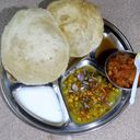 Spicy chickpea curry served with deep-fried fluffy bread, a popular north indian dish