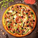 Topped with pizza sauce, beef crumble, pepperoni, green pepper, red onion, black olive, mushroom & mozzarella cheese