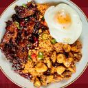 Korean style bulgogi beef served with garlic mushroom, sunny side up and tom yum fried rice