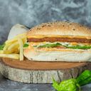 1:1 - Prepared with lightly toasted bun with chicken, fresh veggies & sauce inside