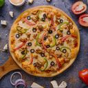 Freshly baked dough topped with secret base tomato sauce, chicken pepperoni, red tomato, capsicum, full of mozzarella cheese & black olive.