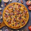 Freshly baked dough topped with secret base tomato sauce, american bbq sauce, fresh grilled chicken, tomato, capsicum, full of mozzarella cheese & black olive.