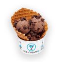 Freshly prepared chocolate flavored ice cream served with chocolate chips on top