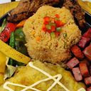 Mexican rice, beef Cumbel, dori fish, chicken square, vegatable.