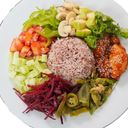 1:1 - A colorful, gut-soothing meal featuring red rice, corn, lettuce, mango, beetroot, bell pepper, carrot, ginger, assorted nuts & seeds