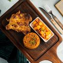 1:1 - Tender grilled chicken thigh marinated in peruvian spices & served with your choice of 2 hearty side-kicks