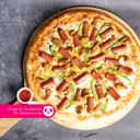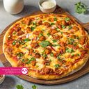 A smokey pizza topped with bbq chicken, cheese, olive, capsicum & onion