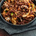 1:1a popular Korean dish of warm rice topped with seasoned vegetables, marinated octopus, squid, shrimp, crab, a fried egg, and spicy gochujang chili paste, all mixed together before eating for a flavorful, hearty meal