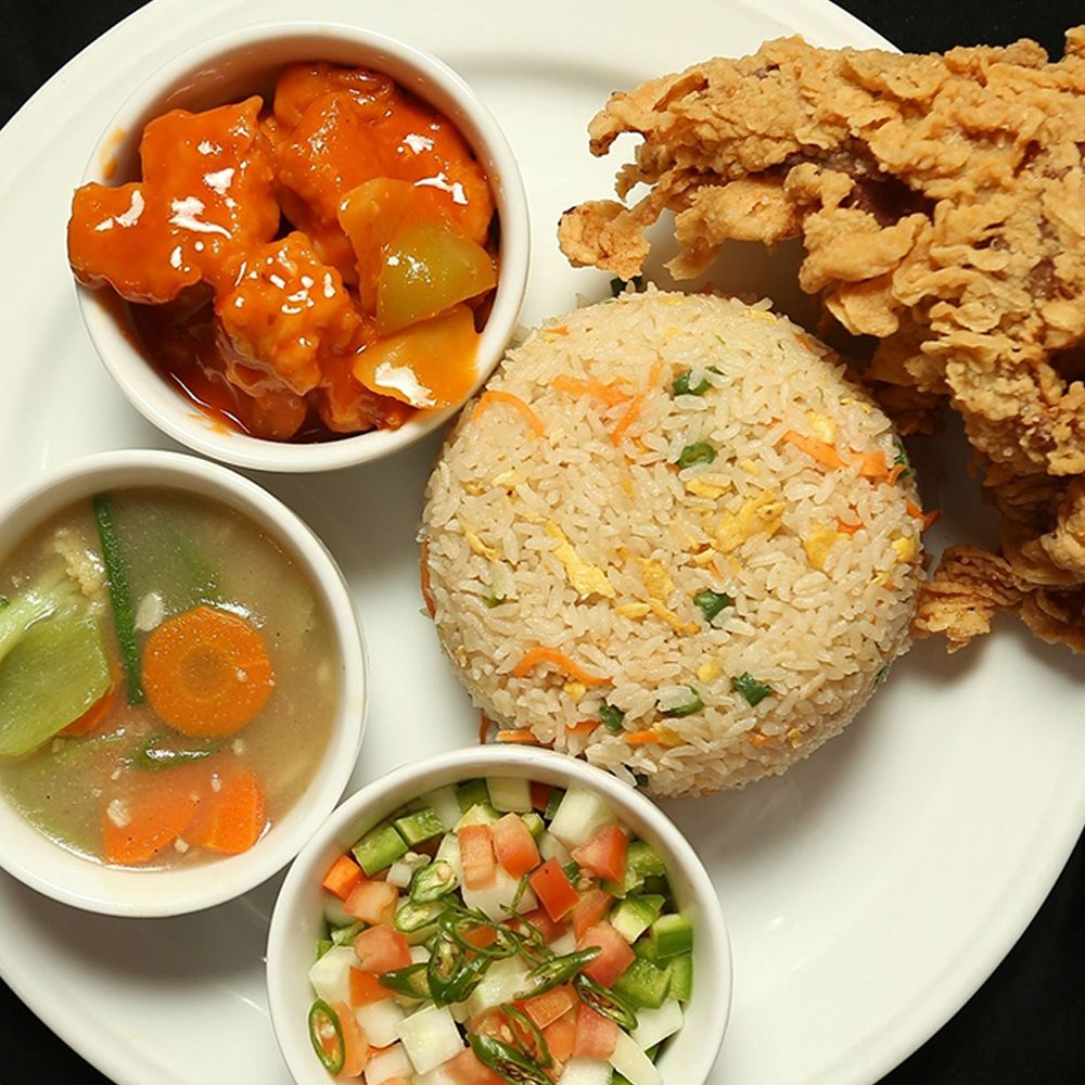 1:1 - Consists of fried rice, crispy fried chicken, chicken chili, vegetable & soft drinks