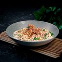 1:1 - Prepared with spaghetti, creamy pesto, prawn, garlic & parmesan