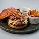 1 pc - Experience pure decadence with a juicy ground beef patty, enriched with rich, buttery bone marrow, topped with melted cheddar cheese, crisp lettuce & thick tomato slices, all of this is nestled in a soft, buttery brioche bun, served alongside a helping of golden wedges, this burger promises an indulgent, mouthwatering bite every time