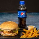 Consists of 1 pc chicken cheese burger, 100 gm fries with honey mustard sauce & 1 pc 250 ml pepsi