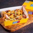 Perfectly cooked classic chicken popcorn paired up with thick hand cut fries, house special garlic aioli sauce & a generous mix of tomato salsa is taken up a notch with the creamy coating of flaming naga sauce