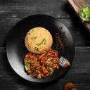 Savory rice topped with tender chicken, seasoned with aromatic black pepper & fresh vegetable