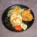 1:1 - Consists of fried rice, gravy vegetable, prawn tempura, chicken chili onion & salad