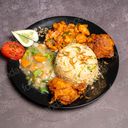 1:1 - Consists of fried rice, gravy vegetable, 2 pcs thai fried chicken, chicken masala & salad