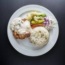 1:1 - Consists of crispy chicken mushroom with melted mozzarella cheese, served with fried rice, sauteed vegetable & mashed potato