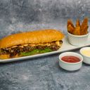 1 pc - Prepared with roasted beef, mayo dressing, sliced cheese, chimichurri mayo, caramelized onion, chinese cabbage, tomato, served with a small side of potato wedges & garlic mayo dip