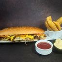 1 pc - Prepared with Sliced Beef, with Melted Mozzarella and Sliced Cheddar Cheese, Mayo Dressing, Grilled Onion, Tomato, Chinese Cabbage, and Small Side of Potato Wedges & Garlic Mayo Dip