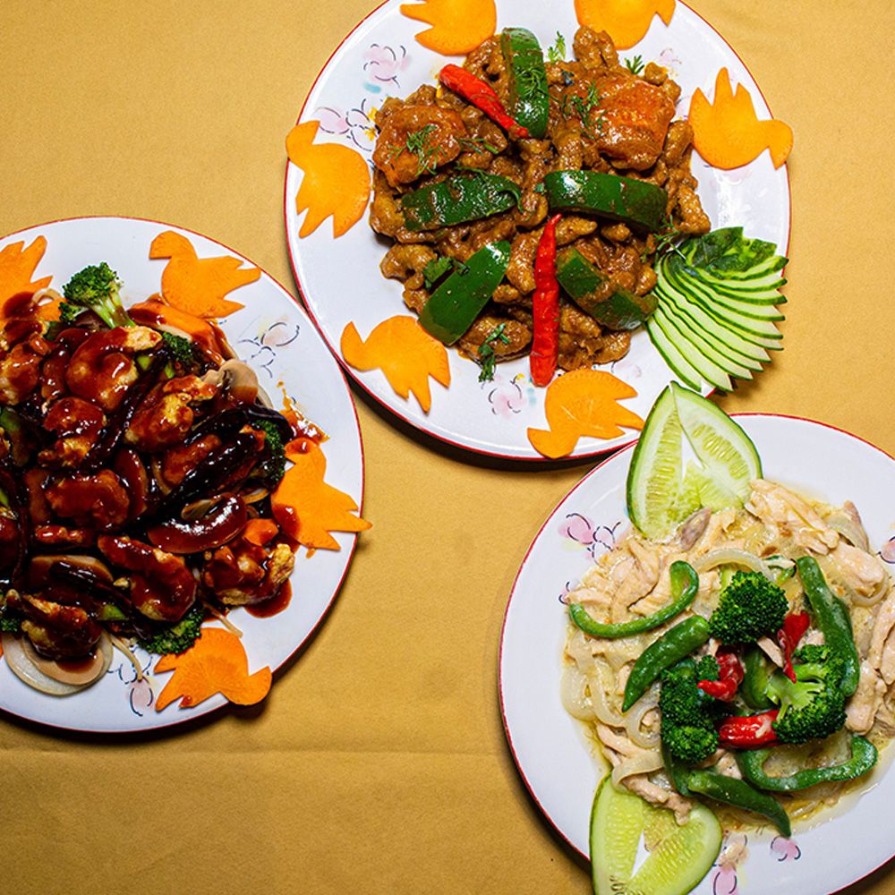 1:1 - Consists of egg vegetable mixed fried rice, 2 pcs thai fried chicken, mixed vegetable, special beef masala & 1 pc thai prawn finger