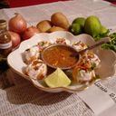 1:1 - Traditional bengali dish prepared with chickpeas, chili & diced potatoes topped with sour tamarind tok & crushed fuchka shell