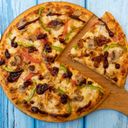 Topped with heavy cheese, beef, chicken, black olive, tomato & capsicum