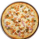 Topped with cheese, chicken, tomato, green chili, onion, oregano & pizza sauce